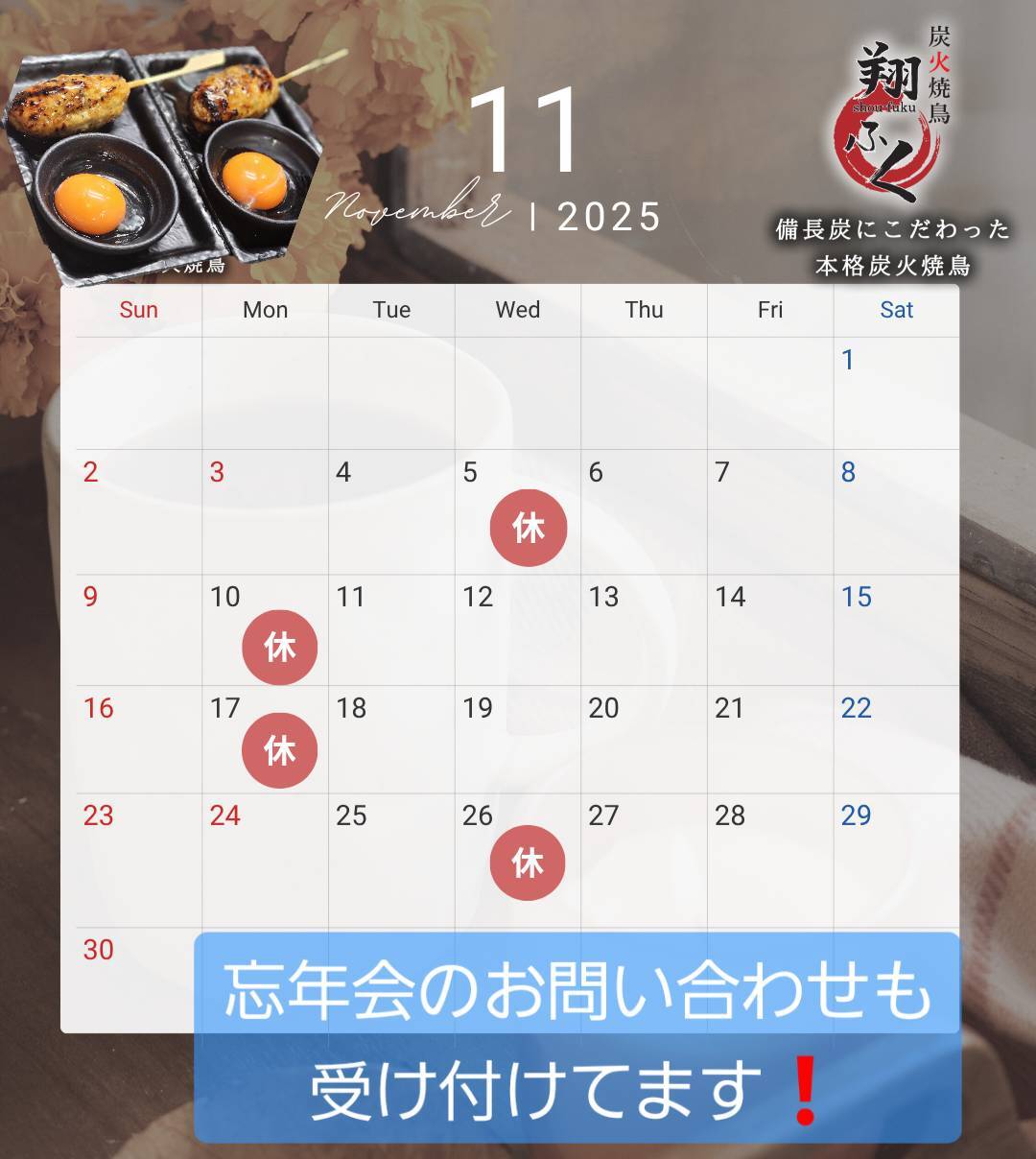 2025.11.01 休業日 11月の店休日 11月の店休日予定ですm(__)m5日(水)10日(月)17日(月)26日(水)ご来店前に確認をお願い致します。席の予約や飲み放題付き宴会ご予約も承ってます。※早期、忘年会予約もお問合せください。 ≫ PDFを開く